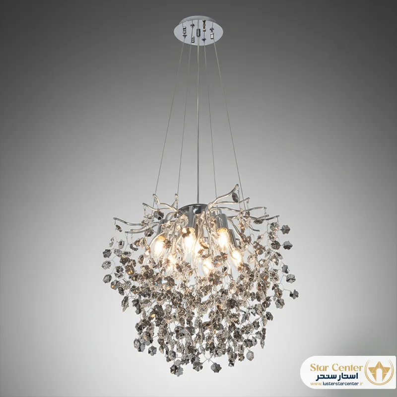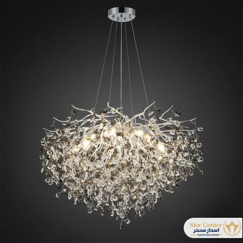 بدنه این لوستر درختی از آلومینیوم نرم ساخته شده و در دو رنگ اصلی طلایی و کروم عرضه میشود. برای بدنه کروم، طراحان از کریستالهای دودی استفاده کردهاند که زیبایی مدرن و خاصی به آن میبخشد. در مقابل، بدنه طلایی با کریستالهای سفید، سفید عسلی و عسلی تزئین شده که جلوهای شیک، گرم و بسیار لوکس به فضا اضافه میکند. این لوستر با منبع نور E14 طراحی شده که به شما امکان میدهد از لامپهای متنوع با این پایه استفاده کنید.
