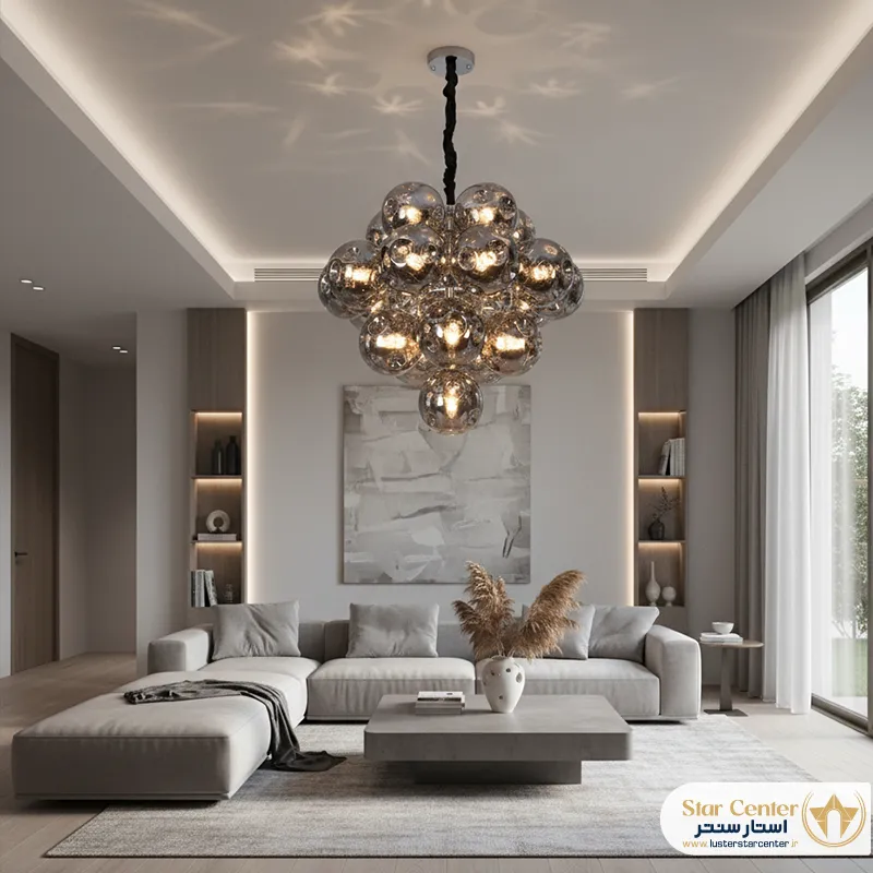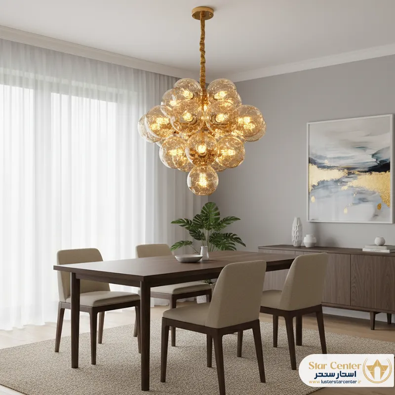 - این لوستر چه نوع حسی را در فضا ایجاد میکند؟به دلیل استفاده از لامپهای شمعی و نور گرم، حس ایجاد شده بسیار آرامشبخش، گرم و صمیمی است. در عین حال، فرم مدرن و هنری آن، فضا را شیک، خلاقانه و امروزی نشان میدهد. این لوستر تعادل خوبی بین راحتی و زیبایی مدرن برقرار میکند.