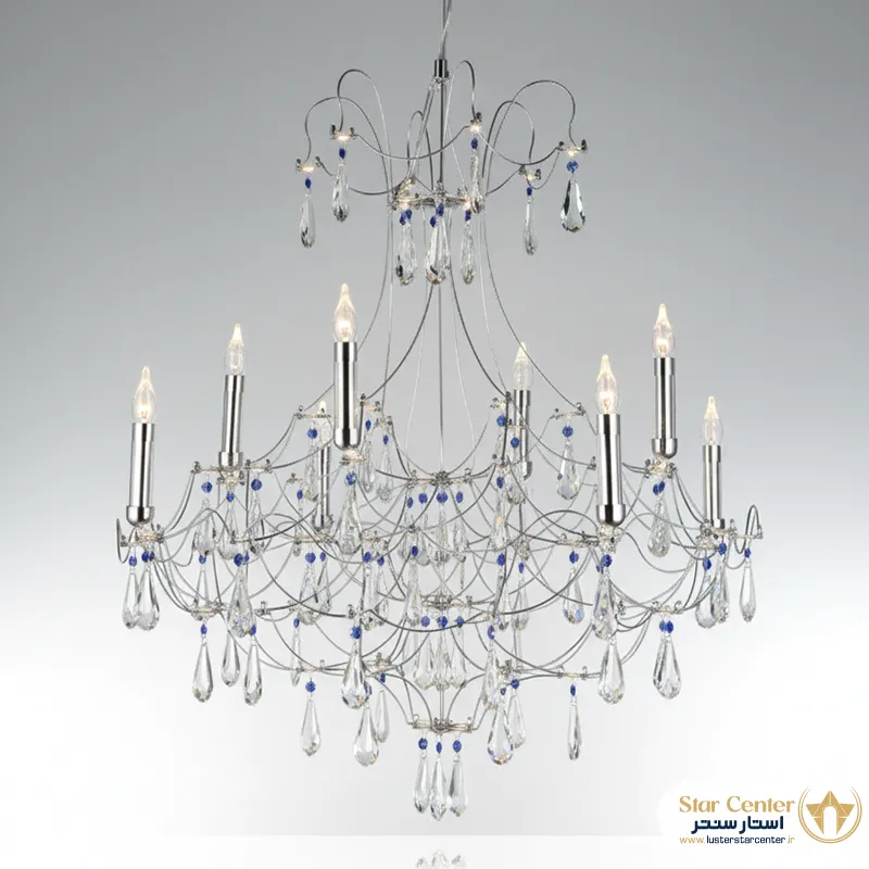 لوستر پست‌مدرن کریستال نوا با طراحی متفاوت و هندسی خود، نمایی مدرن و در عین حال هنری به فضای شما می‌بخشد. ساختار اصلی این لوستر از مفتول‌های استیل ضدزنگ ساخته شده که علاوه‌بر استحکام بالا، ظاهری مینیمال و جذاب ایجاد می‌کند. در نقاط اتصال شاخه‌ها، کریستال‌های اصل سواروفسکی به‌کار رفته‌اند تا جلوه‌ای درخشان و لوکس ایجاد شود و بازتاب زیبای نور، فضا را چشم‌گیرتر کند.