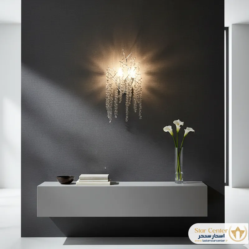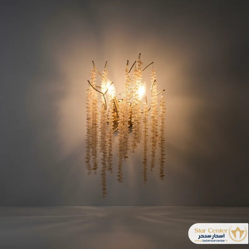 - طراحی هنری و دکوراتیو: فرم درختی و آویزهای کریستالی، این دیوارکوب را به یک المان تزئینی زیبا بر روی دیوار تبدیل میکند.